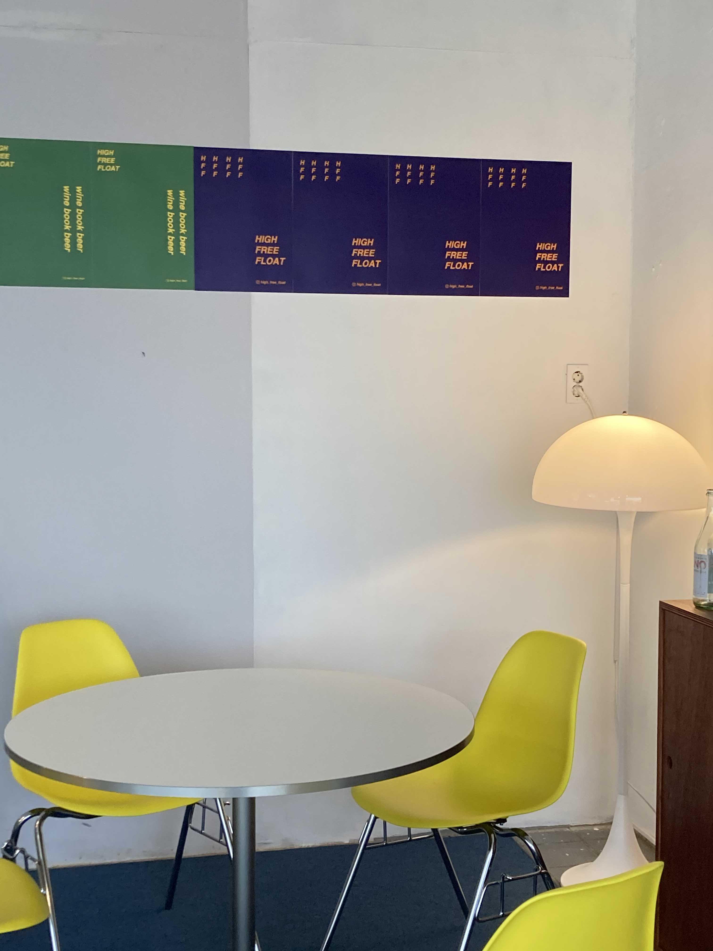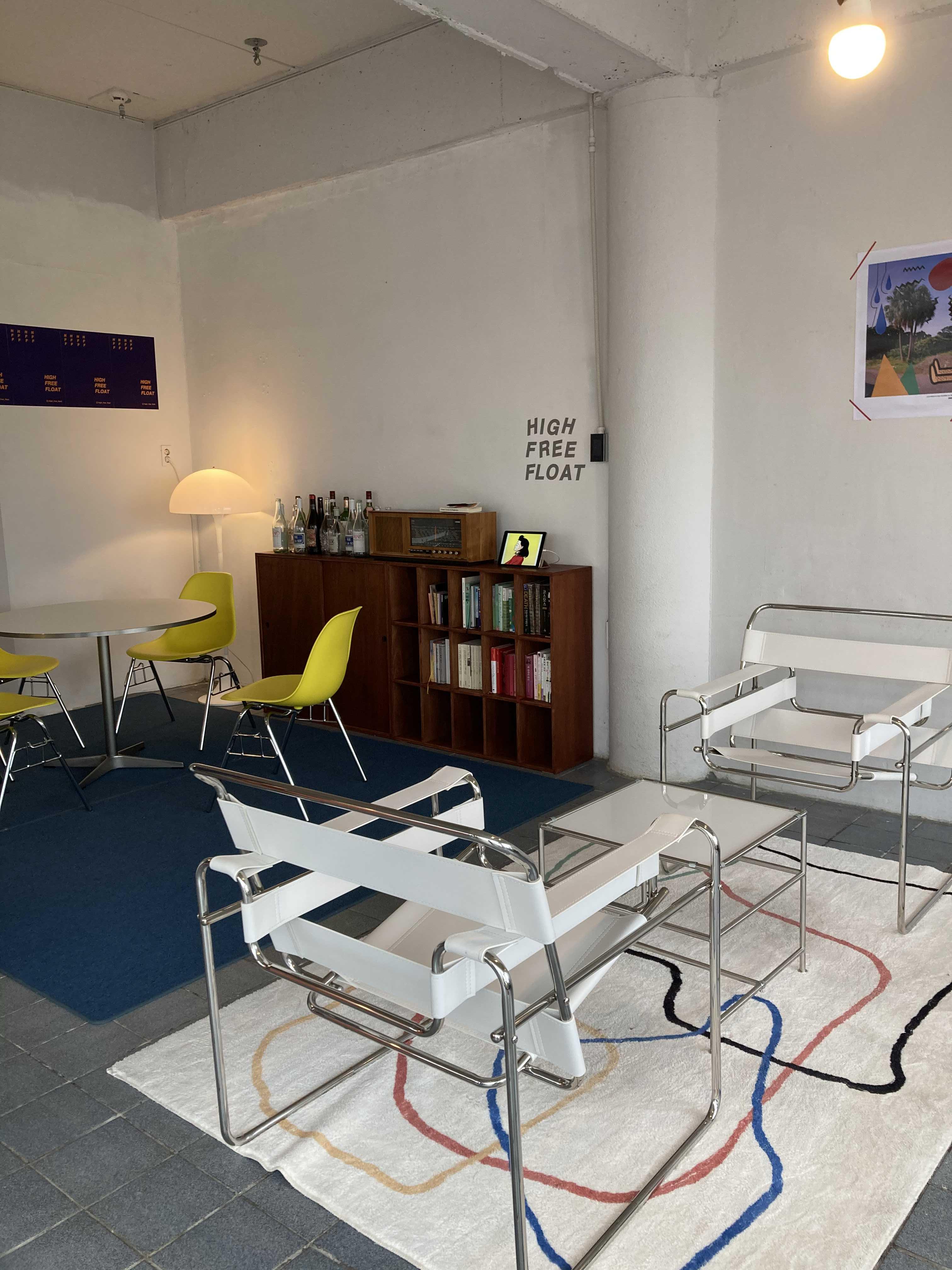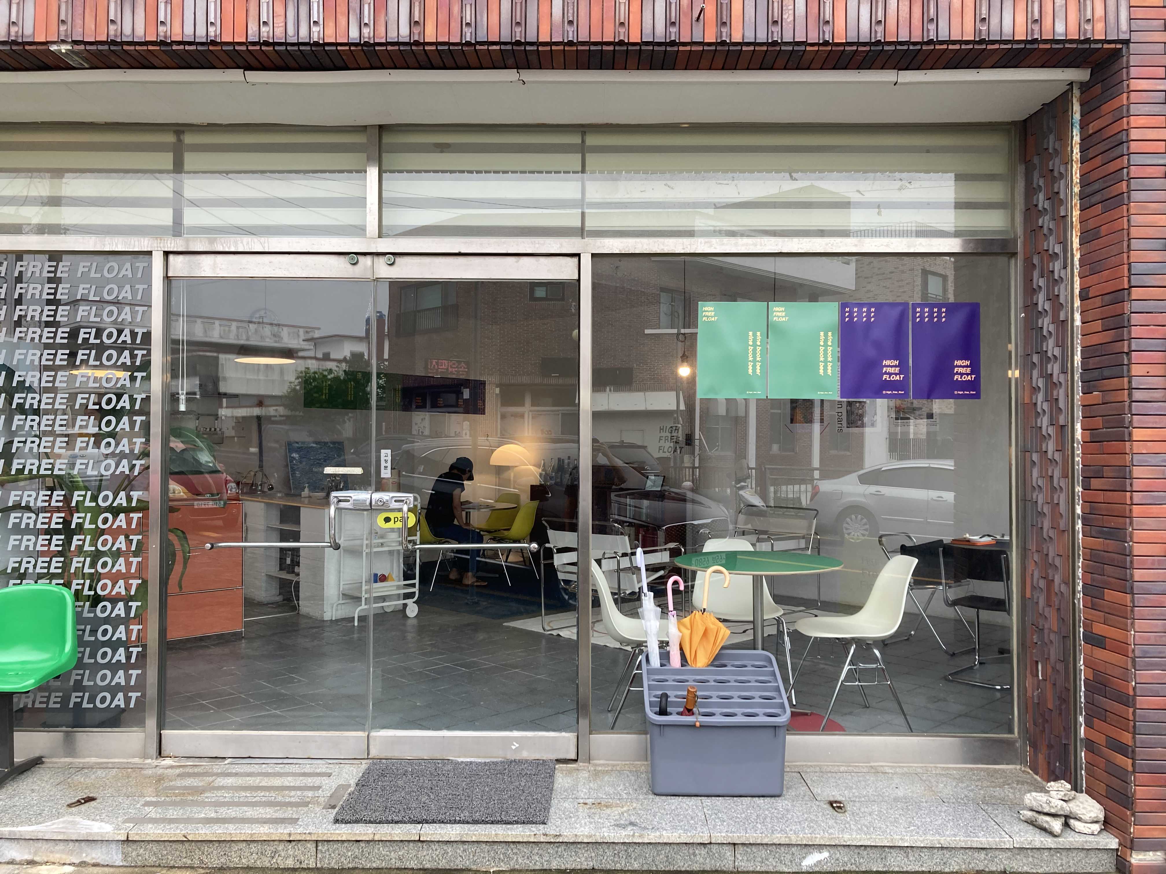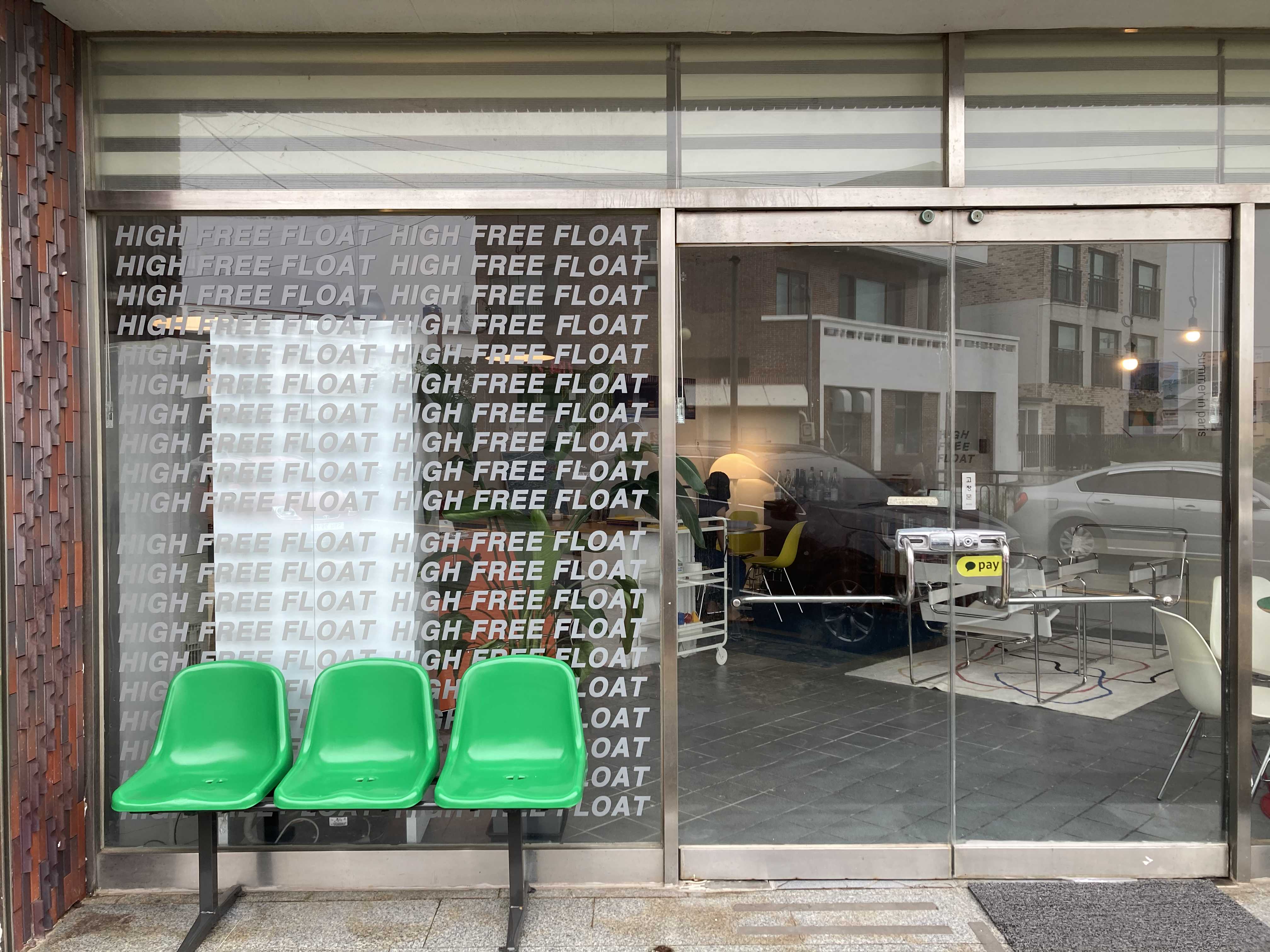 도착하자마자 보이는 초록색깔 의자랑 노란색 입간판